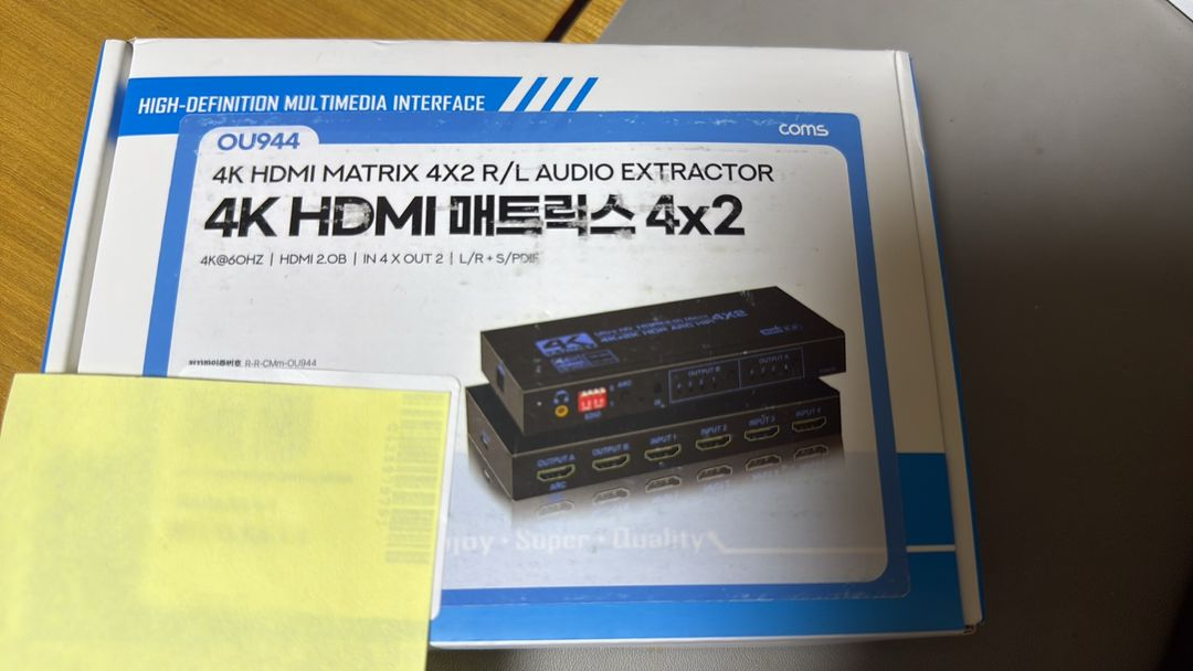 Coms HDMI 4*2 매트릭스입니다 최대 4대의 콘솔을 동시에 2개의 모니터로 이용할 수 있으며 각각의 모니터에 다른 화면을 송출할 수 있습니다. 1회 연결 후 판매합니다.