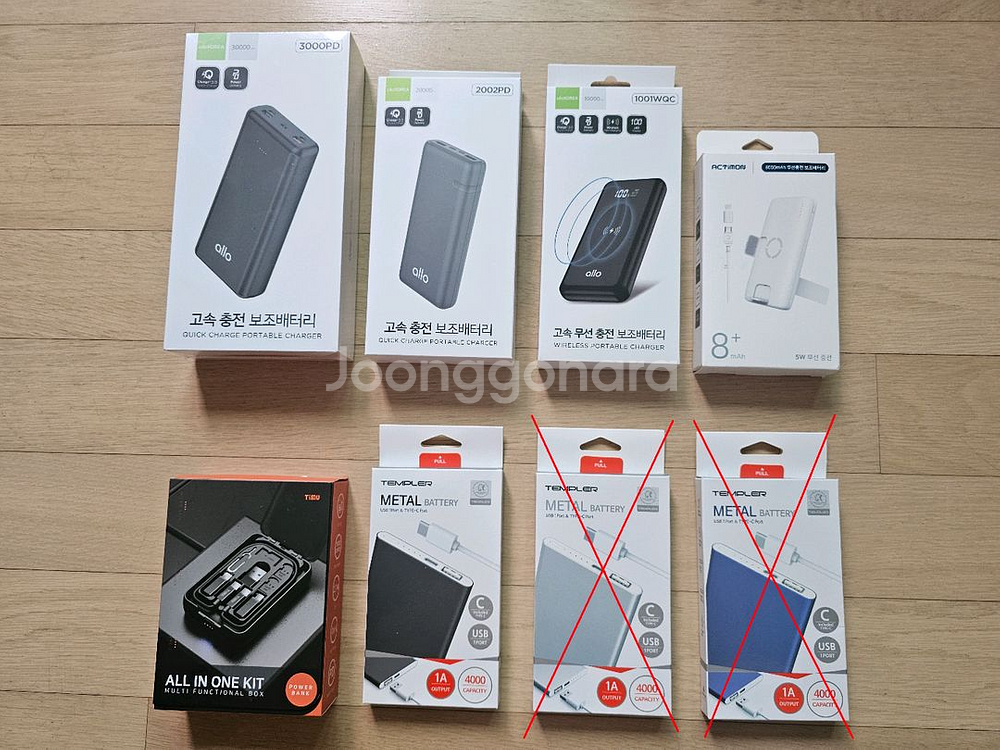 대용량(로모스)/무선고속충전(알로, 액티몬)/도킹형(스마텍) 보조배터리, 무선충전 거치대 전부다 미사용입니다. 소장 보관하고 있던 거 내놓습니다. <1번째 사진>-------------------------------------- 1.1 알로 allo3000PD 고속충전 : 33,000원 - 30,000mAh, 111Wh, 과충전 방지 - PD3.0&QC3.0 초고속, 3 in 1 케이블 - 입력(3): Micro USB, 라이트닝 8핀, C타입 - 출력(3): USB(2), C타입 고속 1.2 알로 allo2002PD 고속충전 : 27,000원 - 20,000mAh, 74Wh, 과충전 방지 - PD3.0&QC3.0 초고속, 3 in 1 케이블 - 입력(2): Micro USB, C타입 고속 - 출력(3): C타입 고속, USB 고속(2) 1.3 알로 allo1001WQC NEW코드X 고속무선충전 : 39,000원 - 10,000mAh, 37Wh, 과충전 방지 - PD3.0&QC3.0 초고속, LED표시창 - 입력(2): Micro USB, C타입 고속 - 출력(3): C타입 고속, USB 고속, 최대 15W 무선패드 1.4 액티몬 MON-PW-B8000 고속무선충전 : 10,000원 - 용량: 8,000mAh, 29.6Wh, 과전압/과전류 보호 - C타입 케이블, 8핀 젠더 - 입력(2): Micro USB, C타입 - 출력(4): USB(2), C타입, 무선 5W 1.5 티뮤 올인원 파워뱅크, 멀티 충전 케이블 키트 TA-P1 : 22,000원 - 5,000mAh, PD 지원 - micro SD카드/나노 유심x2 슬롯, 유심 추출 핀 - C타입 to C타입 케이블, C타입 to micro 5pin/8pin/USB-A 젠더 1.6 템플러 메탈 : 각 4,500원 - 4000mAh, C타입 <2번째 사진>------------------------------------------------ 2.1 로모스 대용량, 고속충전 PEA60 : 50,000원 - 60,000mAh, 222Wh(22.5W 고속), LED표시창 - PD3.0&QC3.0 초고속 - 입력(3): Micro USB, C타입, 라이트닝 8핀 - 출력(4): USB(2), USB(fit+) 고속, C타입 <3번째 사진>------------------------------------------------- 3.1 만끽 디스플레이 듀얼 도킹형 TEN-G-5 10000mAh, 37Wh (입력 C타입, 출력 C타입/8핀) : 13,000원 3.2 알로 일체형 미니 도킹형 allo501DC, 5000mAh (입력 C타입, 출력 C타입) : 12,000원 3.3 디스플레이 듀얼 도킹형 21700-1S1P, 5000mAh (입력 C타입, 출력 C타입/8핀) : 11,000원 3.4 텐지 디스플레이 듀얼 도킹형, 5000mAh (입력 C타입, 출력 C타입/8핀) : 11,000원 3.5 액정 듀얼 도킹형, 5000mAh (입력 C타입, 출력 C타입/8핀) : 10,000원 3.6 스마텍 2WAY 일체형, STPB-MB50 C , 5000mAh (입력 C타입, 출력 C타입/8핀) : 10,000원 3.7 비즈 듀얼 미니 BZ-P10C, 5000mAh (입력 C타입, 출력 C타입/8핀) : 9,000원 3.8 SEIDE 도킹형, 5000mAh (입력 C타입, 출력 C타입/8핀) : 9,000원 3.9 MARK ONE 도킹형 듀얼, 5,000mAh (입력 C타입/USB, 출력 C타입) : 8,000원 3.10 액티몬 MON-P-MINI5000, 5000mAh (입력 C타입, 출력 C타입) : 8,000원 3.11 엑스트라 볼트-S9 21700, LED잔량, 4,500mAh (입력 C타입/USB, 출력 C타입) : 17,000원 3.12 알리오 I-FAST 도킹형 듀얼고속충전, 5000mAh, PD 22.5W충전 (입력 C타입, 출력 C타입/8핀) : 13,000원 3.13 알리오 I-MINI 도킹형, 5000mAh (입력 C타입, 출력 C타입/8핀) : 10,000원 3.14 듀얼 포켓 HY21700B-4500, 4,500mAh (입력 C타입, 출력 C타입/8핀) : 7,500원 3.15 MARK ONE 도킹형 듀얼, 4,500mAh (입력 C타입/USB, 출력 C타입) : 6,500원 <4번째 사진>---------------------------------------------- 4.1 바운스멀티 Qi 펜꽂이형 고속 무선충전기 & 블루투스 스피커 : 19,000원 - 알리오(ALIO) 바운스 멀티 Qi, 배터리:1,200mAh, 충전입력: USB-C - 블루투스 버전: 5.2, 무선충전출력: 5W/7.5W/10W, 스피커출력: 3W 4.2 LED 스마트폰 거치형 고속 무선충전기 & 블루투스 스피커 : 14,000원 - 알리오(ALIO) 바운스 QI 라이팅 거치형 BQI-L110 - 블루투스 버전: 5.0, 무선충전출력: 5W/10W, 스피커출력: 3W 4.3 알리오(ALIO) 2세대 아이콘 고속무선충전 팬꽂이 거치대 : 12,000원 - 무선충전출력: 5W/7.5W/10W 4.4 리큐엠(Re:QM) 무선 고속 충전기 B1500A : 17,000원 - 15W 고속충전지원(5W/7.5W/10W/15W), Qi 무선 호환, 양방향 충전 - 폴더블 타입, C Type 케이블 포함 - 안전한 충전(과충전방지, 과방전보호, 과전력보호, 과전류방지, 과전압방지, 온도보호, 회전단락보호)