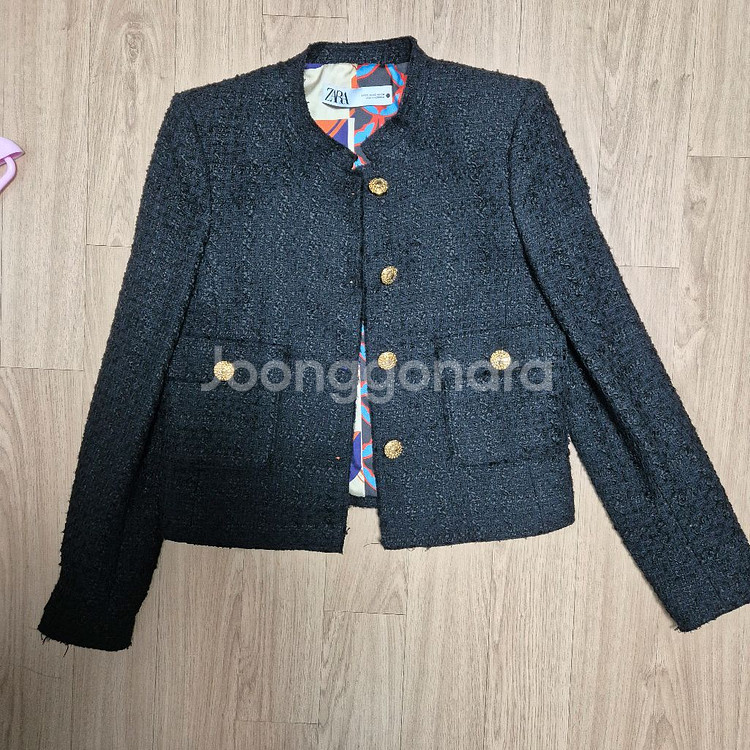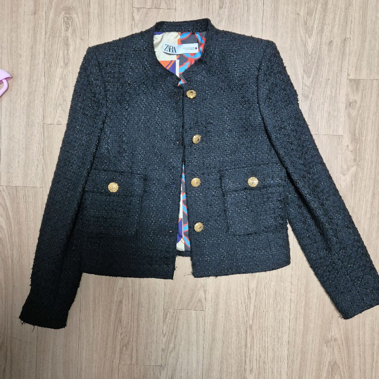 자라 블랙 트위드 자켓입니다. 금장 단추로 포인트를 주어 고급스러움을 더했습니다. 안감 패턴도 유니크해서 너무 예뻐요. 문의 없으시면 바로 안전결제해주시면 됩니다! 알뜰택배 반값택배 +2500 일반택배 +4000