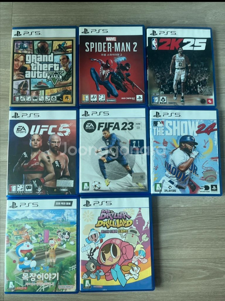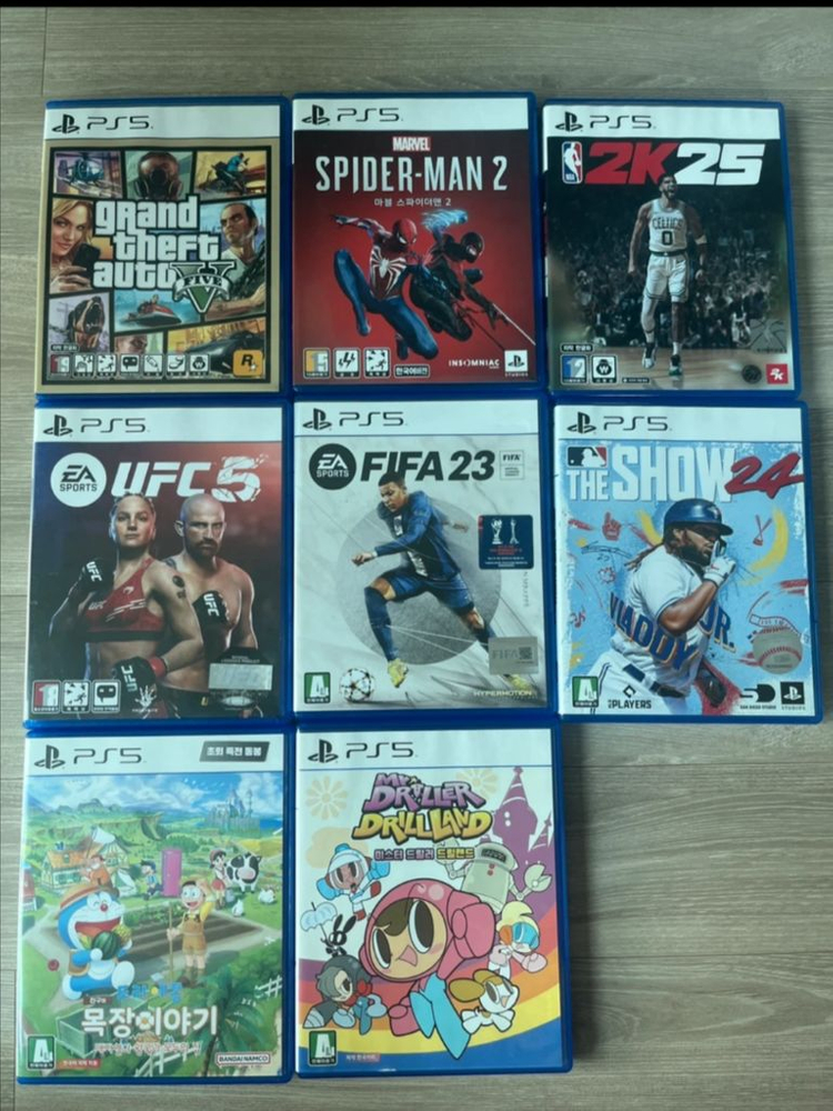 개인정보(거래정보)를 주고받는 행위는 사기에 노출될 수 있으므로 즉시 중고나라로 신고해 주세요PS5용 게임 8개 세트로 그타5,스파이더맨2, NBA2K25, UFC5, FIFA23, 야구게임, 독장이야기 등 인기 타이틀들이 포함되어 있어요. 케이스 상태도 양호하고 모두 정상 작동합니다.