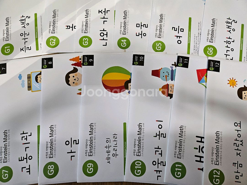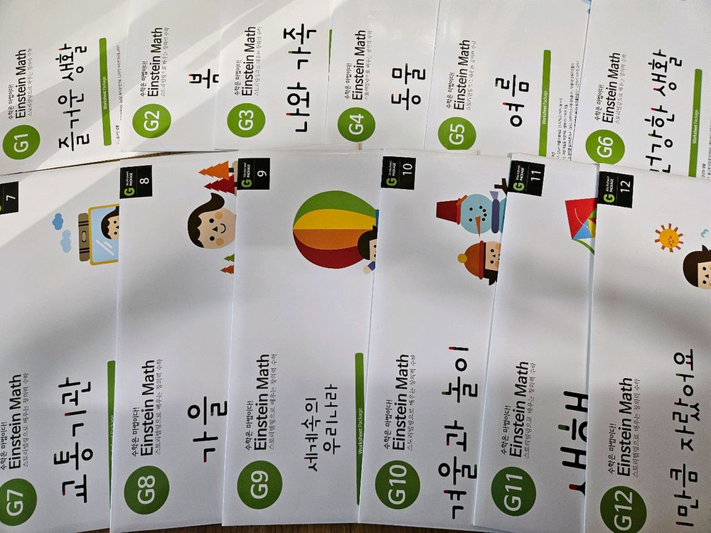 Einstein Math 아인슈타인 수학 G단계(G1-G12) 교재 G1-G12 12권 워크시트 G1-G12 12패키지 생활 속의 수학을 스스로 생각하는 스토리텔링으로 재미있게 배워요. (주제: G1 즐거운 생활, G2 봄, G3 나와 가족, G4 동물, G5 여름, G6 건강한 생활, G7 교통기관, G8 가을, G9 세계속의 우리나라, G10 겨울과 놀이, G11 새해, G12 이만큼 자랐어요) 구입 후 거의 사용하지 않은 깨끗한 수준 (G1 교재만 연필 사용 흔적, 사용감 있음) 전체 40,000원, 택배비 별도