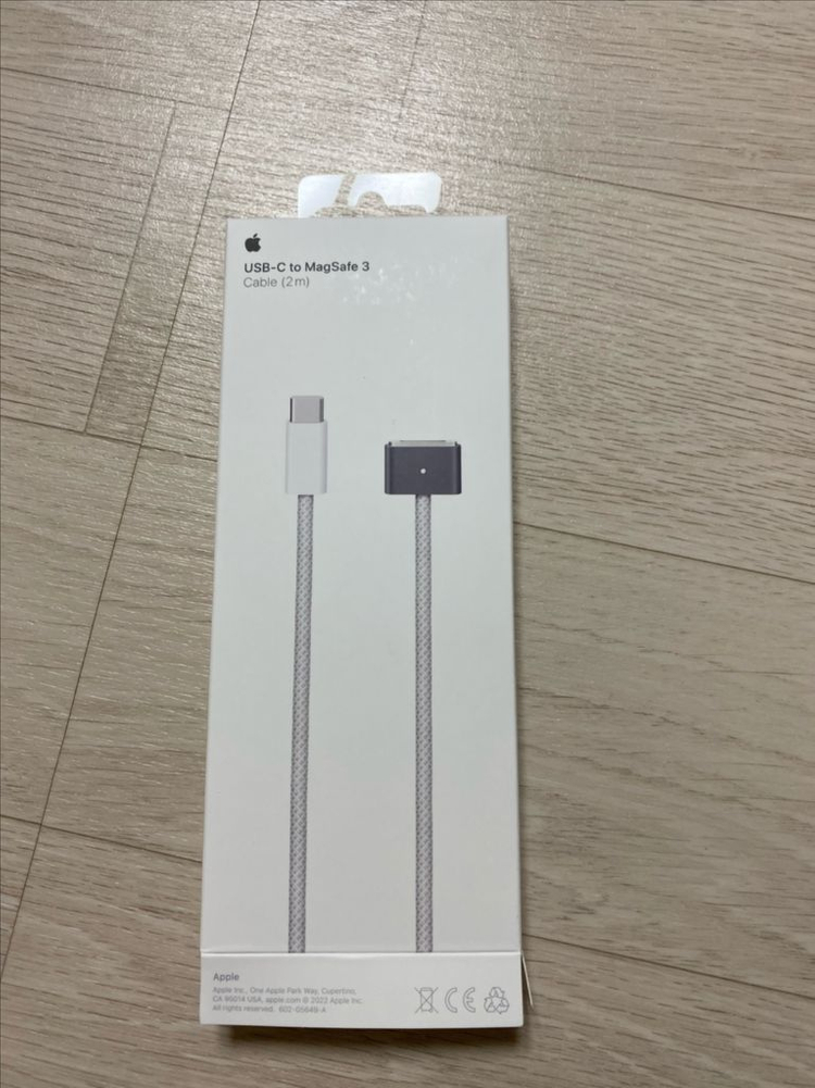정품 USB-C to MagSafe 3 케이블입니다. 박스 포함 새 제품 상태로 깔끔하게 보관되어 있어요. 잘못 주문해서 개봉만 하고 사용횟수 0입니다.