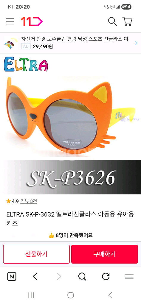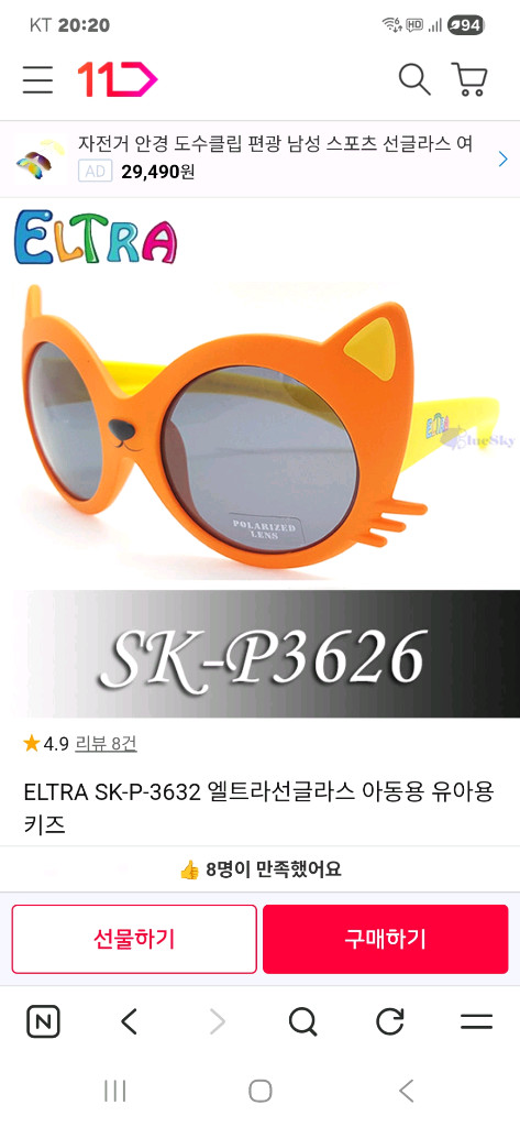 귀여운 고양이 캐릭터 디자인의 아동용 선글라스예요. 오렌지와 노란색 프레임에 화이트 리본 포인트가 있어서 아이들이 좋아할 것 같아요. 사용감은 있지만 상태 양호합니다. 엘트라 유아 선글라스