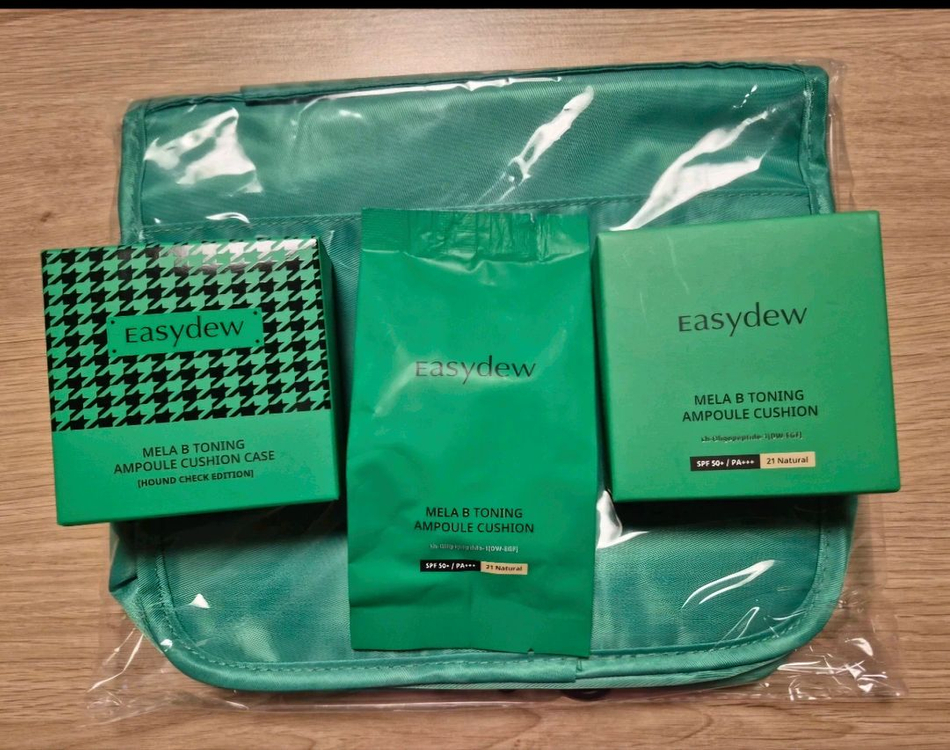한가인 이지듀 멜라 비 토닝 앰플 기미 쿠션 21호 풀세트 새상품입니다 (본품1+리필1+에디션케이스1+트래블백1) 이번에 1주년 기념으로 나온 하운드 체크 에디션 케이스도 포함되어 있는 세트상품입니다. 아주 산뜻하고 활용도가 좋은 이지듀 트래블백(새상품)도 포함되어 있습니다. 오늘 선물로 택배받은 상품인데 저는 쟁여 두고 사용중이라 오늘 받은 이 상품은 필요하신 분께 판매합니다. 모두 완전 미개봉 새상품이며 유효기간은 27년입니다.