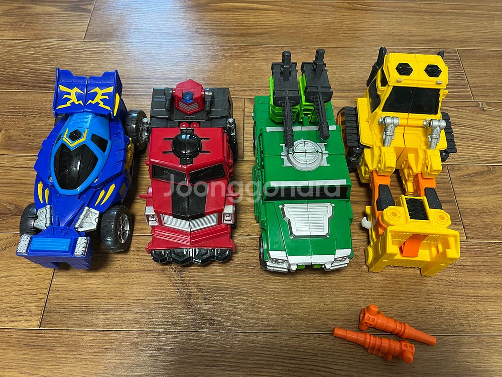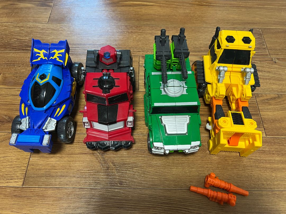 변신 로봇 장난감 4대와 추가 무기 부품들이 포함된 세트예요. 아이가 잘 가지고 놀았던 중고 제품이라 사용감은 있지만 변신 기능은 모두 정상 작동합니다.