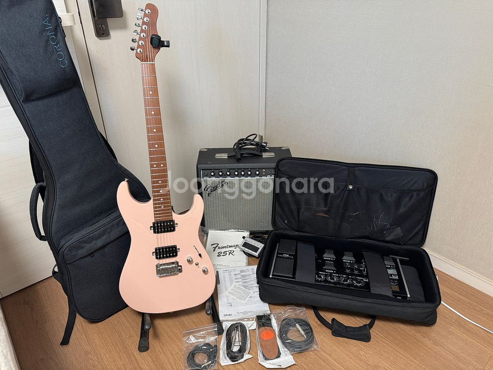 코로나 모던플러스 shell pink + Korg 멀티이펙터 AX-3000G + Fender Frontman 25R 기타앰프 세트 판매합니다. 1.일렉기타 24년에 신제품 구매 후 집에서만 실사용 5번도 안쳐봤습니다. 2. 멀티이펙터도 실사용 5회 미만입니다. 정상 작동합니다. 3. 앰프는 사용감이 많이 있지만 집에서만 사용하였고, 정상 작동합니다. 취미로 하시는 분들이 사용하기 좋은 구성입니다.