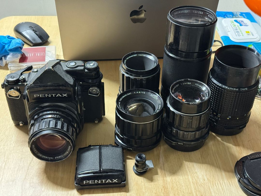 펜탁스 67,렌즈, 웨이스트 레벨 파인더 판매합니다. 중고물품, 세월이 오래된 카메라인만큼 수유동 직거래 선호하며 택배거래시 노리턴 조건으로 거래합니다. Pentax 67 TTL 중기형 (6×7 필름, 미러업) (사용감 다수, 60이하 저속셔터 이상있음,격자 파인더) Takumar 6x7 75mm F4 (MF / 6×7) (대물렌즈 코팅 까짐 조금 있음) Takumar 6x7 105mm F2.4 (MF / 6×7) (도장 까짐 진행중) Takumar 6x7 135mm F4 (MF / 6×7) Takumar 6x7 150mm F2.8 (MF / 6×7)(필터부 찌그러짐 있어 필터 사용 불가) SMX PENTAX 67 200mm F4 (MF / 6×7) Takumar 6x7 300mm F4 (MF / 6×7)(조리개 유막있음) Pentax 67 웨이스트 레벨 파인더, 니콘 매그니파이어 포함 일괄 150만원에 판매합니다.
