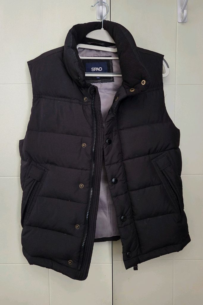 스파오 오리털 패딩조끼 블랙 s사이즈입니다 두툼하고 보온종습니다 보관잘해서 솜죽은것없이 상태는 매우좋습니다 지퍼나단추 이상없고 안주머니도 있습니다