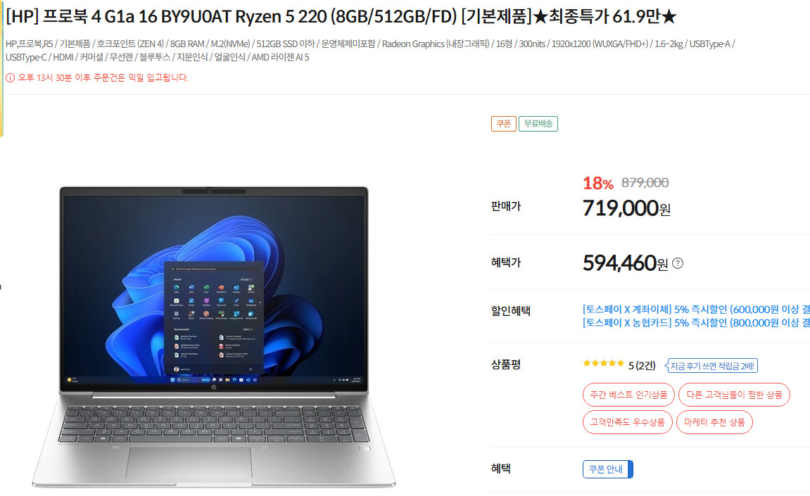 HP ProBook 4 G1a 16 BY9U0AT 중고 HDD 3TB 같이 드립니다 Ryzen 5 5220 프로세서, 8GB RAM, 512GB SSD 사양입니다 조카 선물용으로 구매했는대 여학생에게 휴대하기에는 무거워서 판매합니다. 3월 2일 구매했고 개봉하고 os 설치만하고 미사용 입니다