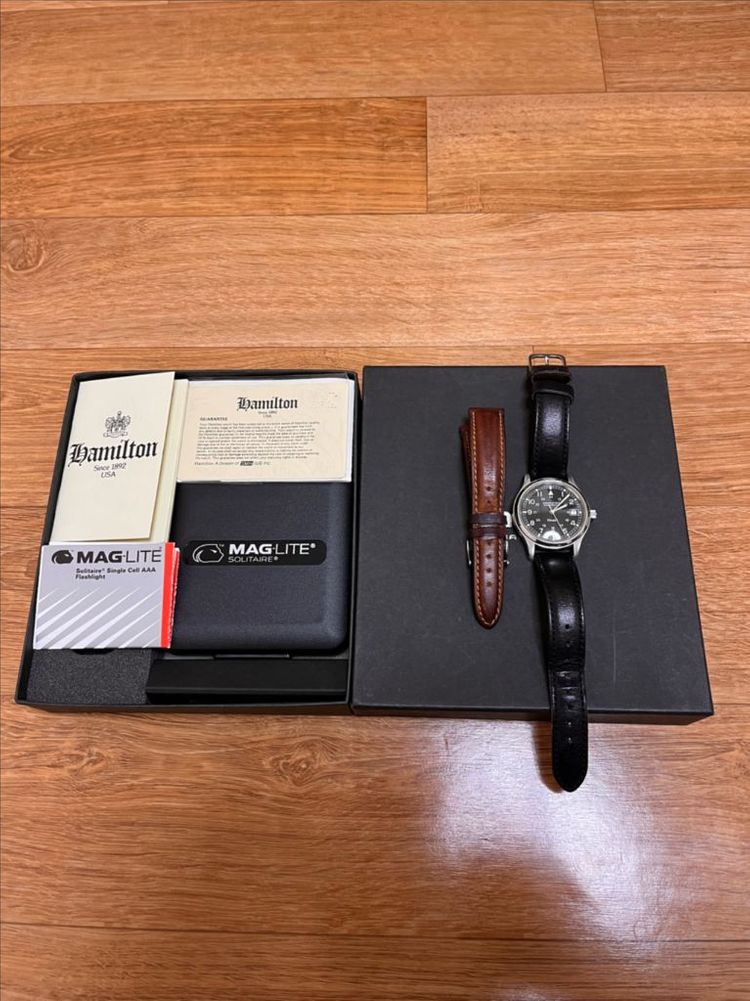 구성품은 시계 본품, 스트랩(정품 가죽줄, 사제 가죽줄, 사제 브레이슬릿), 손전등 및 상자, 보증서, 설명서(2종), 종이박스 입니다. 시계 본품은 큰 흠집은 없으나 생활기스 있습니다. (글라스도 미네랄 글라스이다 보니 마찬가지 입니다) 정품 스트랩은 가죽소재 이기도 하고 세월이 있다보니 사용감이 많이 있습니다. 별도 사진 필요하시면 보내드리도록 하겠습니다. 그외 별도 특이사항은 없습니다. 전 판매자님께 23년 하반기에 사설에서 오버홀 하였다고 들었습니다. 현재 오차는 사진을 참조해 주시기 바랍니다. (어플로 측정한거라서 실제와는 차이가 있을 수 있습니다.) 5호선 행당역에서 직거래 하고요 택배거래 시 선불 5천원 추가 입니다. 또한 가품외 사유를 제외하고 환불은 불가하니 참고해 주시기 바랍니다. 가능하면 직거래를 선호하며 분실시 별도 책임은 지지 않습니다. 그럼 편하게 연락주세요~