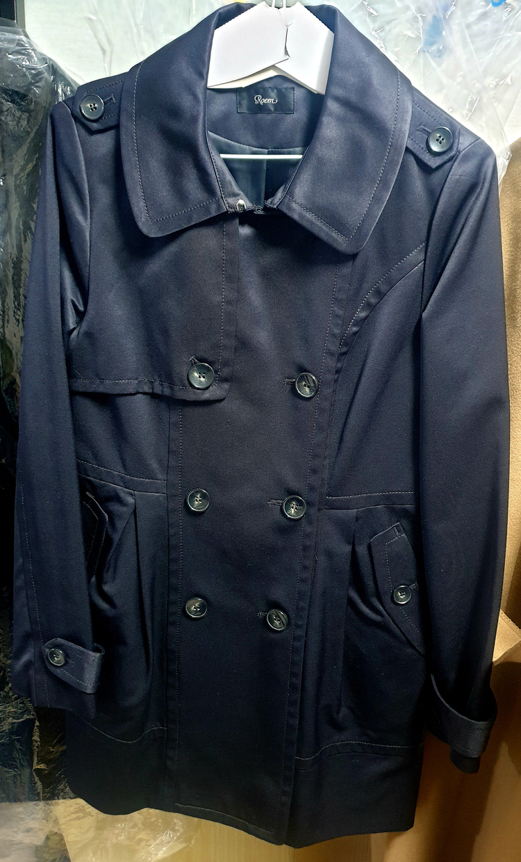 네이비 컬러의 여성용 더블브레스트 트렌치코트예요. 클래식한 디자인에 실용적인 포켓과 깔끔한 상태로 보관되어 있어요. 세련된 느낌으로 데일리나 오피스룩으로 활용하기 좋을 것 같아요. 로엠 상품이며, 55~55 반정도 예쁘게 입으실수 있을거예요