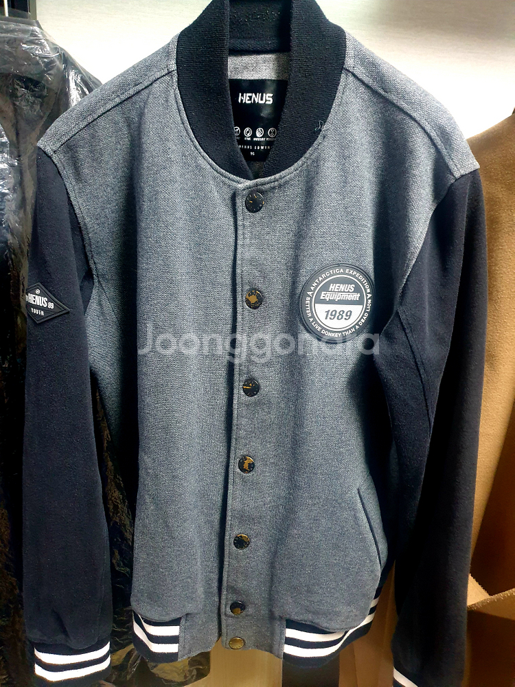 그레이와 네이비 컬러 조합의 바시티 자켓이에요. 앞면에 로고 패치가 있고 밑단 라인 디테일이 포인트입니다. 상태 양호한 중고 제품으로 깔끔하게 관리되어 있어요. 야구점퍼로 남녀 공용으로 입을수 있으며, 90~95 사이즈 입으시기 좋아요