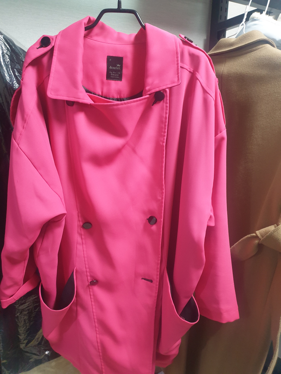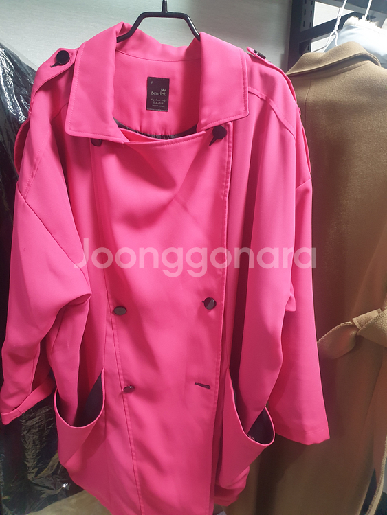 밝은 핑크색 여성용 트렌치코트예요. 더블브레스트 디자인에 앞주머니가 있어서 실용적이고 스타일리시해요. 상태 양호한 중고 제품입니다. 봄에 색감 너무 예쁘구요 입으면 정말 멋스럽답니다 77까지도 충분히 입으실수 있습니다.