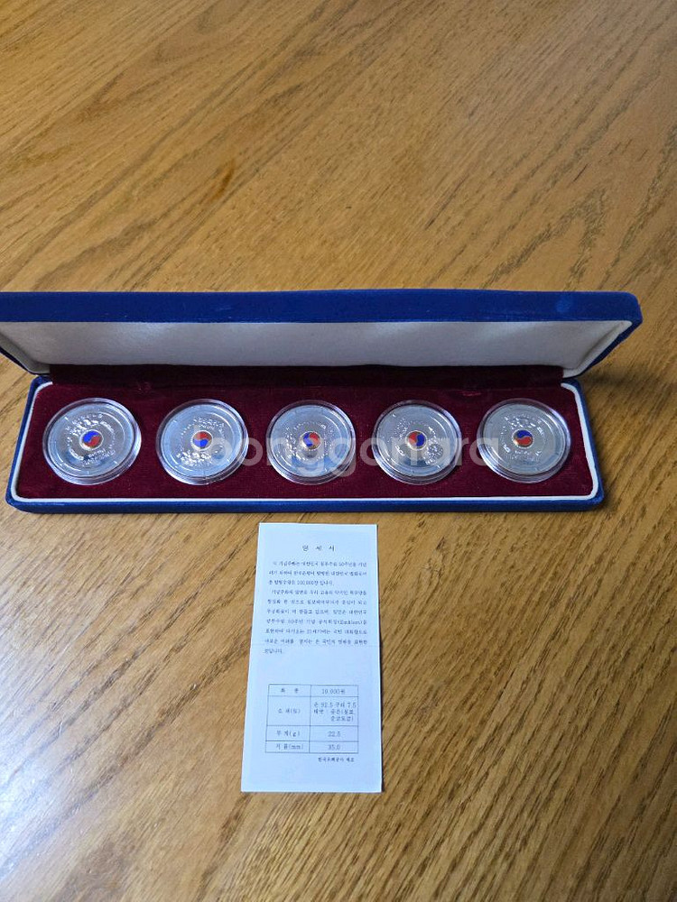 대한민국 정부수립 50주년 은화 5개가 들어있는 세트입니다. 전용 케이스와 보증서가 함께 있어요. 상태 양호한 컬렉션용 아이템입니다. 은 값으로만 개당 8~9만원 정도 입니다. 안심결제 x 택배거래시 개인휴대번호 및.민증 7자리 까지 나오게 공유 가능합니다!