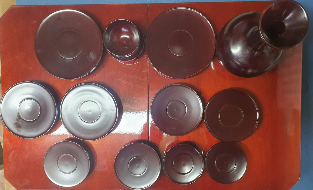 남원공예에서 제작된 무형문화재 노 동식 목기장 옻칠 제기 휴대용세트입니다 나무 재질로 만들어졌으며, 고급스러운 옻칠 마감이 되어있습니다 술병과잔은 별도로 구입한거라 노 동식 목기장 작품은 아닙니다. 거의 사용하지 않았습니다. 잠금고리는 없어졌지만 사용하는데는 문제 없습니다. 무형문화재 노 동식 목기장 보증서도 함께 드립니다