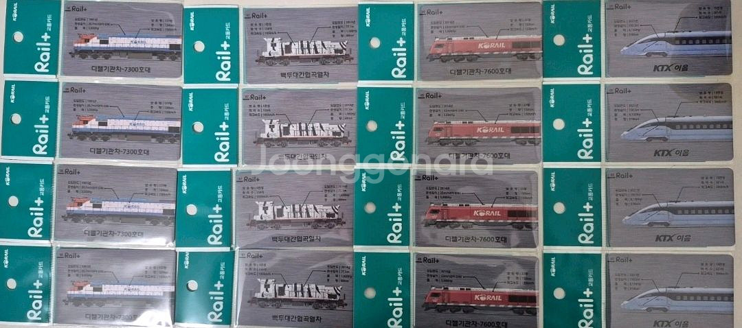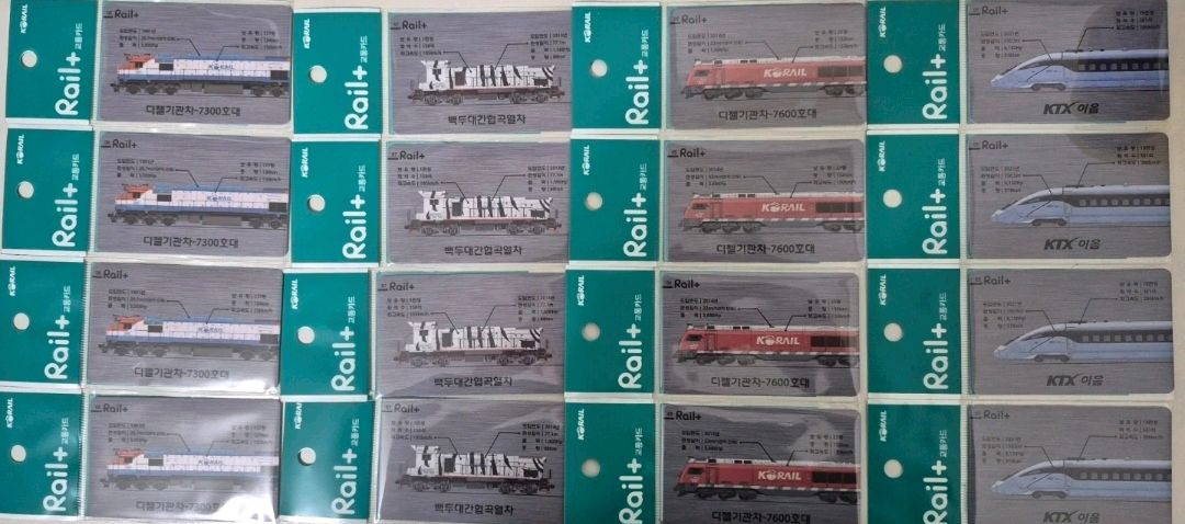 레일플러스 한정판으로 출시된 기차 카드 시리즈 4종 팝니다 KTX-이음, 디젤기관차 7300호대, 디젤기관차 7600호대, 백두대간협곡열차 이렇게 총 4종입니다 장 당 5천5백원입니다 현재 KTX-이음 품절 7300호대 기관차 1장 그 외는 종별로 2장 남았습니다.