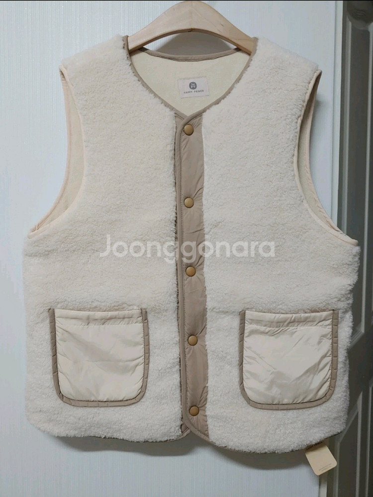 따뜻한 양털 소재의 패딩 조끼예요. 앞면 버튼 디테일과 포켓이 있어서 실용적이고, 전체적으로 깔끔한 상태입니다. 새상품입니다 55.66 가능합니다 다른 새상품들도 구경하세요!!