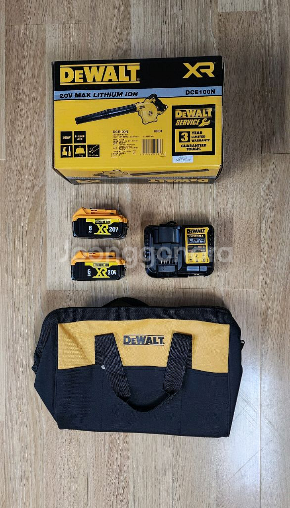 새상품 이에요!! !!중고나라 안심 결제 상품입니다 !! 디월트 정품 송풍기 디월트 A/S 보증되는 제품 디월트 20V MAX 리튬 이온 충전 송풍기 DCE100N 세트입니다 !!가격 네고 문의 사절 !! (구성품) - 송풍기 DCE100N 본체 1개 - 220V 급속 충전기 디월트 정품 DCB1104 - 20V 6AH 배터리 2개 국내 KC 인증받은 호환배터리 - 디월트 공구 전용 중형 소프트백