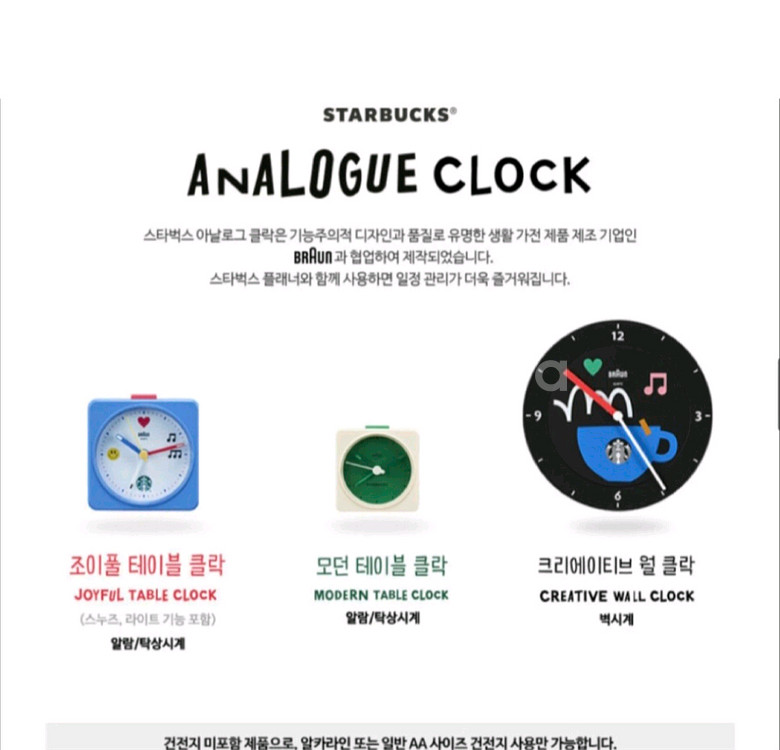스타벅스 브라운 콜라보 탁상 시계 2종 일괄 9,000원 (낱개 5,000원) 새상품 미개봉 프리퀀시 종별 두 개씩 있음 탁상시계, 계산기 1개 5,000원 2개 9,000원 3개 13,000원 4개 16,000원 벽시계 1개 17,000원 벽시계 1개 + 탁상시계 2개 22,000원 카드지갑 1개 6,000원 2개 11,000원 네고 불가능
