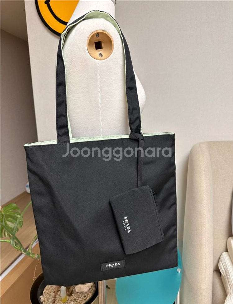 프라다 에코백 사용안한거 당근해요~ 양면이에요 사이즈는 가로세로 37*38cm입니다 보관만했던거라 상태은 거의새거나 다름없어요 편하게 가지고 다니기 괜찮을거 같아요