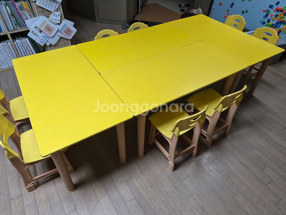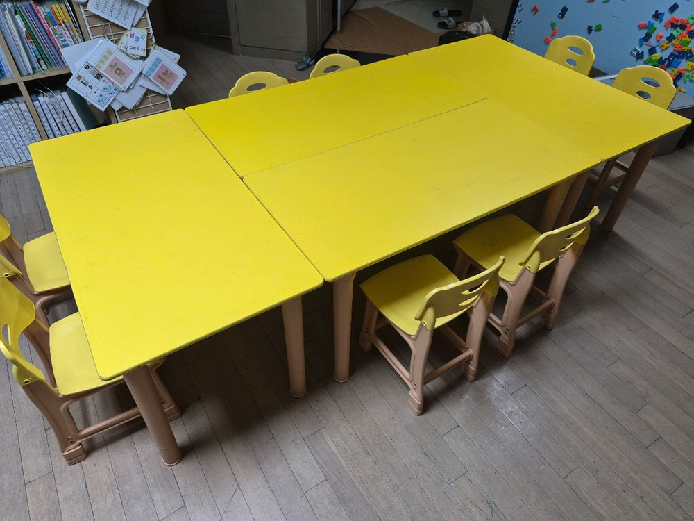 교연교구 책상 의자 4세트(2인용책상4개/의자8개) 일괄 가격 25만원 입니다. 생활기스외 하자없습니다. 제품특성상 직거래합니다. 지역은 인천 남동구 구월동 입니다. 010-5692-3369 밝은 노란색 상판의 아동용 교실테이블과 의자 세트예요. 아이들이 사용하기 좋은 크기이고 상태도 양호합니다. 학습이나 놀이 공간으로 활용하기 좋아요.