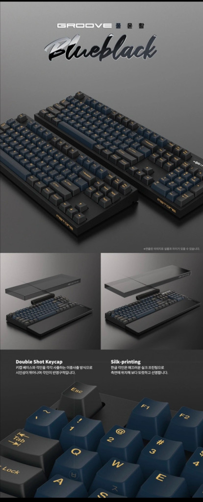 풀윤활 기계식 키보드 그루브스톤 갈축 구하기도 쉽지 않은 기계식 키보드 그루브스톤입니다~! 명불허전 키보드 이 색상도 인기 많으니 구매 희망하시는분 연락주세요~! 먼저 구매하시는분께 판매합니다 그루브 풀윤활 신제품 블루블랙 버전이 입고되어 안내해드립니다 새로운 조합의 블루블랙은 하우징은 블랙, 키캡은 블랙+블루 투톤 구성으로 영문 각인은 이중사출 방식이며 한글 각인은 측각으로 실크인쇄했습니다 구매한지 1년정도 하자 전혀없고 새제품급 구성은 본체, 유선, 전용 덮개, 키보드 박스 입니다~
