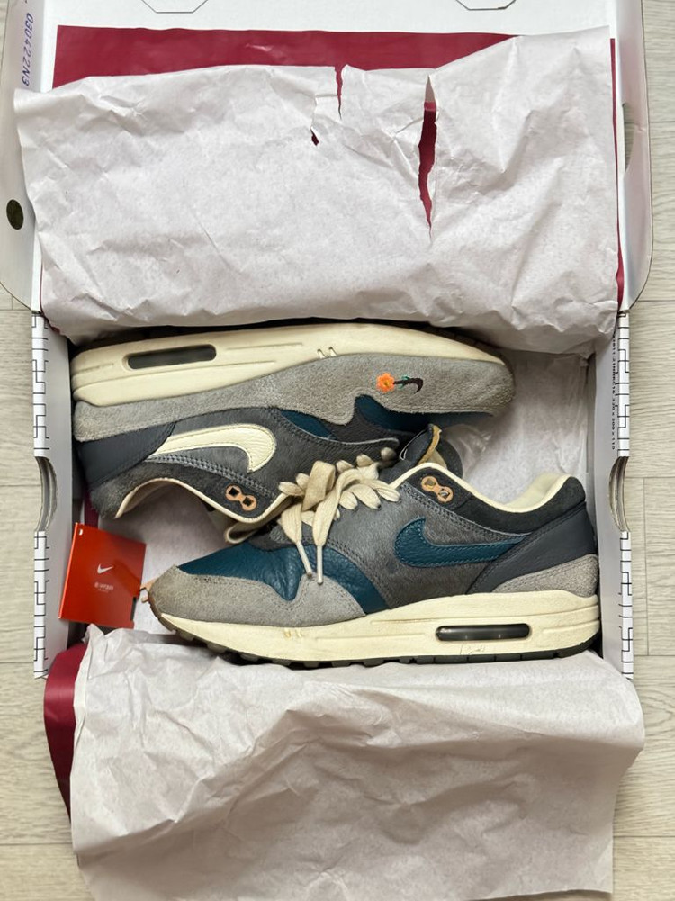나이키 x 카시나 에어맥스1 SP 원앙 판매합니다 사이즈 250이고 그레이 컬러입니다 실착했던 제품이라 사용감 있습니다 나코탭 정품입니다