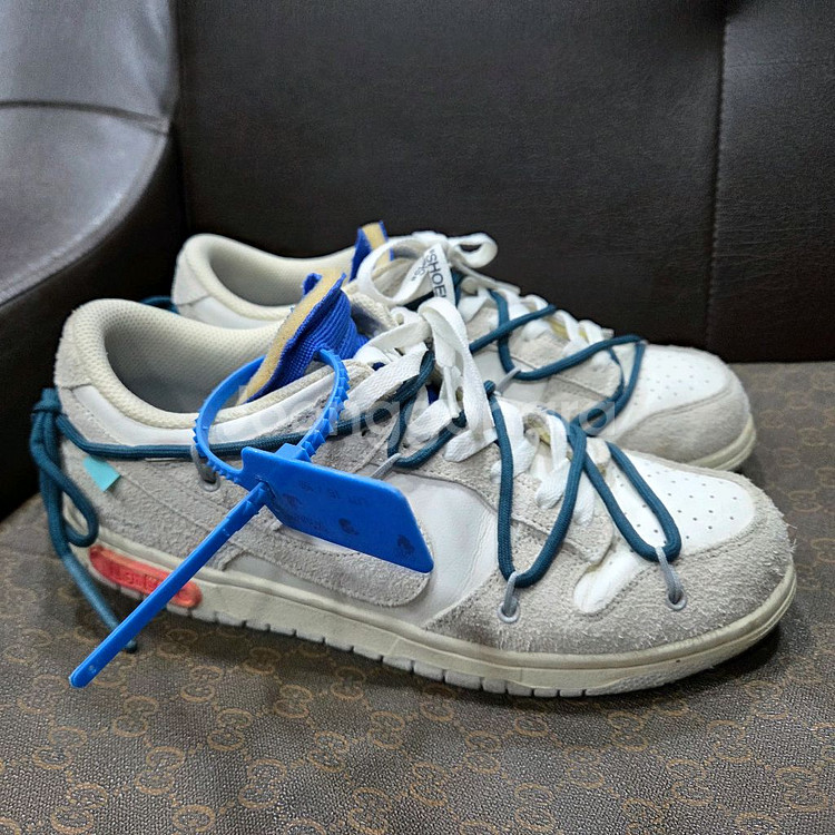 나이키와 오프화이트(Off-White)의 협업으로 탄생한 덩크 로우 '더 50' 컬렉션의 제품입니다. 특히 네이비 컬러의 오버레이 로프와 스웨이드 소재의 조합으로 보아 로트 18(Lot 18) 모델 입니다. 이 컬렉션은 버질 아블로가 디자인한 50가지의 서로 다른 컬러 조합으로 구성된 것이 특징입니다. 270 사이즈 자연사용감 조금외 굽닮음 없이 좋습니다