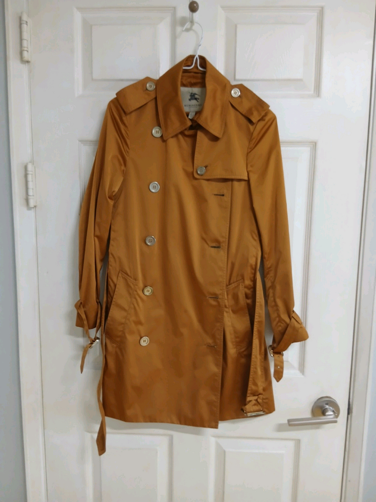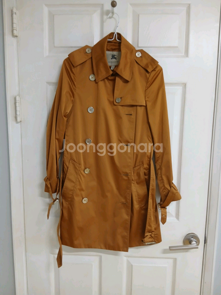 오렌지 색상과 살짝 글로시한 패브릭 효과로 딱 보면 고급스운 느낌입니다. 중간 길이(미드렝스)라 쇼트나 롱보다 일반적입니다. 상태 좋으나, 착용감이 있는 곳은 노란색 원으로 표시했습니다. . 사이즈 및 총장 : 55, 87cm . 색상 : 오렌지 + 골드버튼 . 소재 : 폴리에스터 100% . 제조국 : 이태리