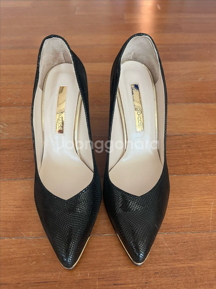 고세(GOCCE) 블랙 스네이크 패턴 펌프스 사이즈: 235mm 설명: 백화점 브랜드 고세 제품임. 은은한 스네이크 패턴 가죽이라 빛에 따라 결이 살아있어 아주 세련돼 보임. 특징: 안쪽 골드 인솔 디테일로 벗어놓았을 때도 예쁨. 참고: 물티슈로 깨끗이 닦는다고 너무 세게밀었더니 로고가 검게 뱐했어요 예민하지 않으신 분이 가져가시면 좋겠음. 쿨거래시 내고 가능