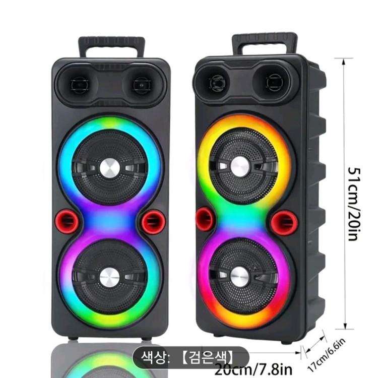 블루투스 스피커 파티 스피커 입니다 단순개봉 후 사진찍기 위해 테스트 후 밀봉 하였습니다 무선 연결 USB TF 카드 지원 으로 다양한 기기와 연결 가능 합니다 RGB 라이트가 내장되어 있어 분위기를 더욱 고조 시킬수 있습니다 마이크 가 포함되어 있어 노래방처럼 즐길수 있습니다 51cm x 20cm x 17cm 크기로 휴대하기 편리합니다 별도 문의 없으시면 바로 안전결제 해주시면 됩니다?!