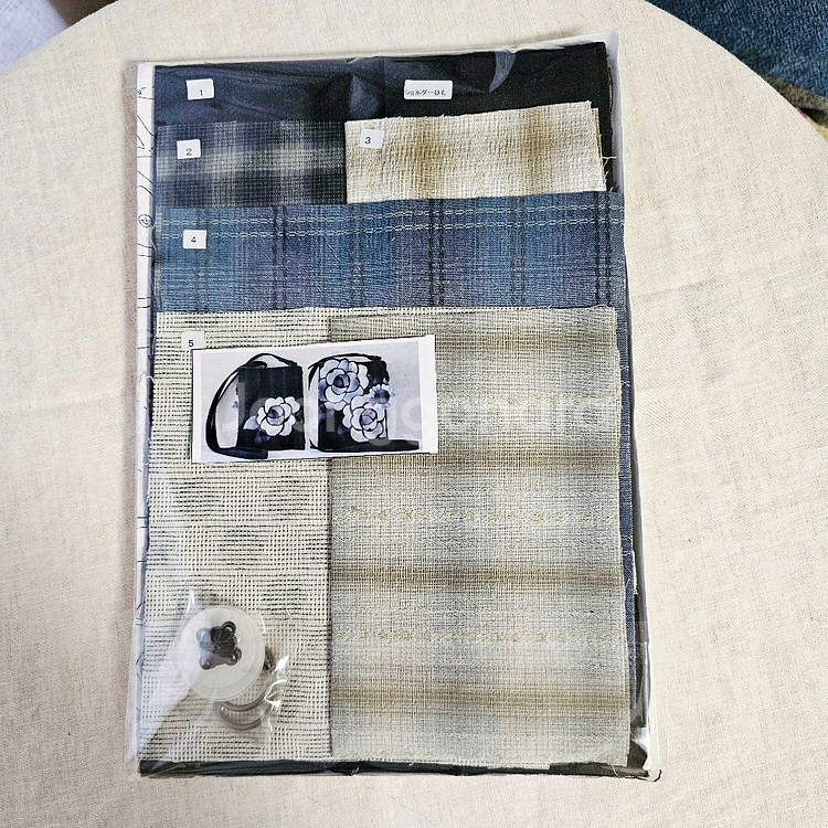 다양한 패턴의 자수 원단들이에요. 네이비 체크, 베이지 무지 등 여러 종류가 포함되어 있고 자수 디자인도 함께 드려요. 직접만드셔야하는 퀼트패키지예요