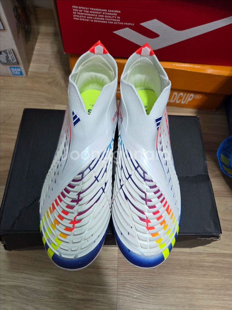 새상품/풀박스) 아디다스 프레데터 엣지+ FG J (240mm) 아디다스 축구화 끝판왕 모델인 프레데터 엣지+ FG J 주니어용 새상품 판매합니다. 월드컵 공인구 컬러인 '알 리흘라' 팩으로 실물이 정말 영롱하고 예쁜 화이트/무지개 컬러입니다. ✅ 제품 특징 • 모델명: 아디다스 프레데터 엣지+ FG J (GW0974) • 사이즈: 240mm (박스 표기 UK 5 / US 5.5 / F 38) • 상태: 미사용 새상품 (택/박스 포함 풀구성) • 등급: 끈 없는 최상급(+) 모델 (보급형이나 일반 모델보다 터치감이 훨씬 좋습니다.) ✅ 상세 설명 • 끈이 없는 타입이라 발등 터치감이 깔끔하고, 아이들이 신고 벗기 아주 편합니다. • 전용 신발주머니(쌕)도 포함된 풀박스 구성이라 선물용으로도 좋습니다. • FG 스터드이지만 주니어용이라 높지 않아 상태 좋은 인조잔디에서도 충분히 신을 수 있습니다. 📍 희망 가격: 120,000원