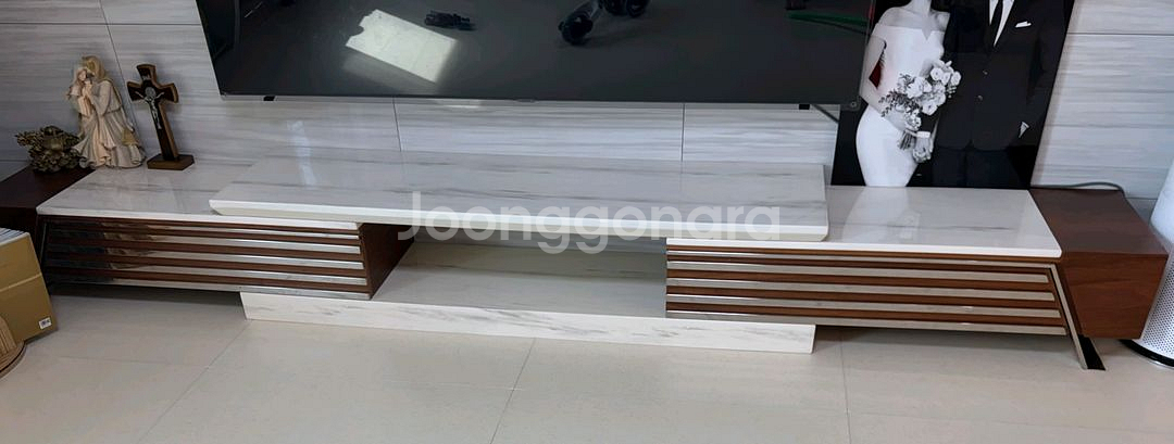 깔끔한 화이트 대리석 패턴과 브라운 우드 디테일이 고급스러운 TV 거치대예요. 상태 양호하고 수납공간도 넉넉해서 실용적입니다. 20년도에 사서 혼자 사용하다가 결혼후 필요없어져서 팝니다.