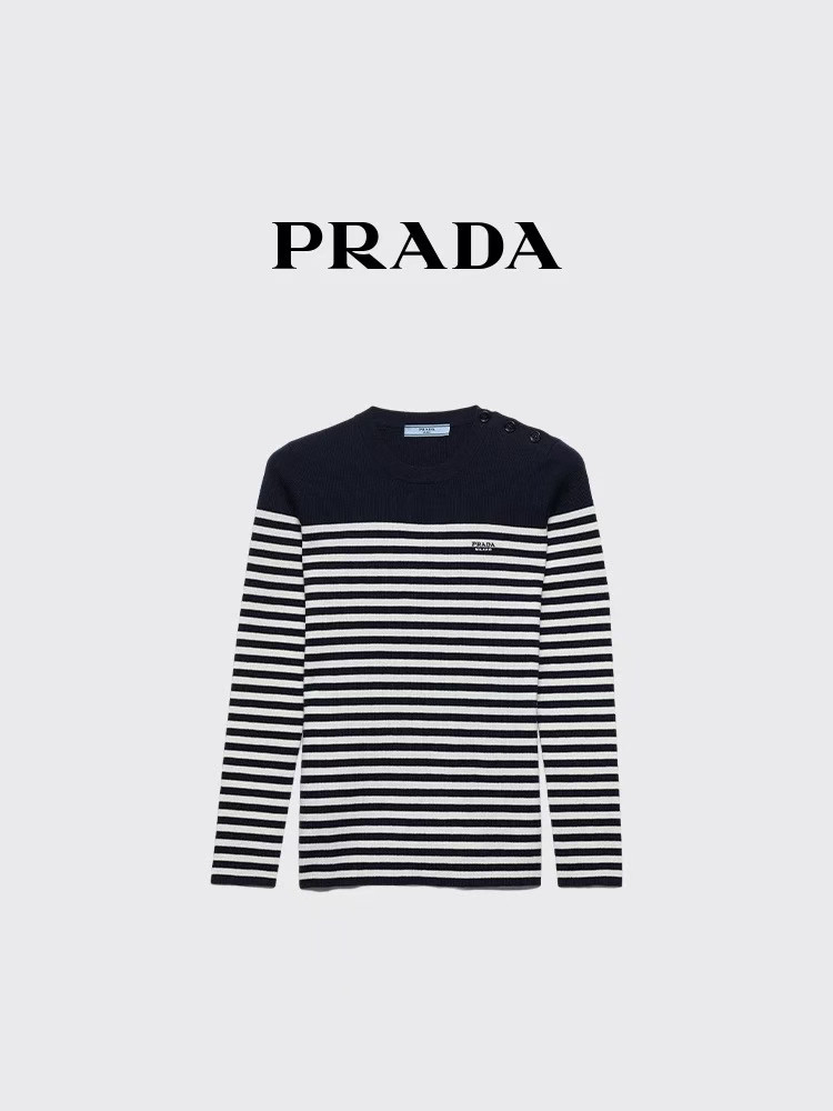 프라다 밀라노 스트라이프 니트입니다 네이비와 화이트 색상의 조화가 돋보이며, 부드러운 면 소재로 제작되어 착용감이 좋습니다 - 캐주얼하면서도 세련된 디자인으로 다양한 스타일 연출이 가능합니다