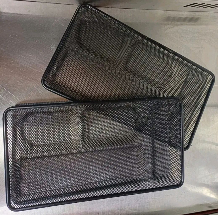 블랙 철제 메쉬 수납 트레이 2개 판매합니다 칸막이가 있어서 펜, 가위, 포크, 숟가락 등 다양한 물건을 깔끔하게 정리하기 좋아요 주방 서랍이나 책상 서랍 정리함으로 활용하기 좋습니다 사용감은 있지만 전반적으로 깨끗하고 튼튼합니다 캠핑용 철제 트레이로도 좋아요 캠핑때 과일이나 야채 담기 좋아요 가로31.5 × 세로17.5 김해 직거래외 택배거래일시 착불 4000원(선불×) 반값택배는 2000원 플러스~