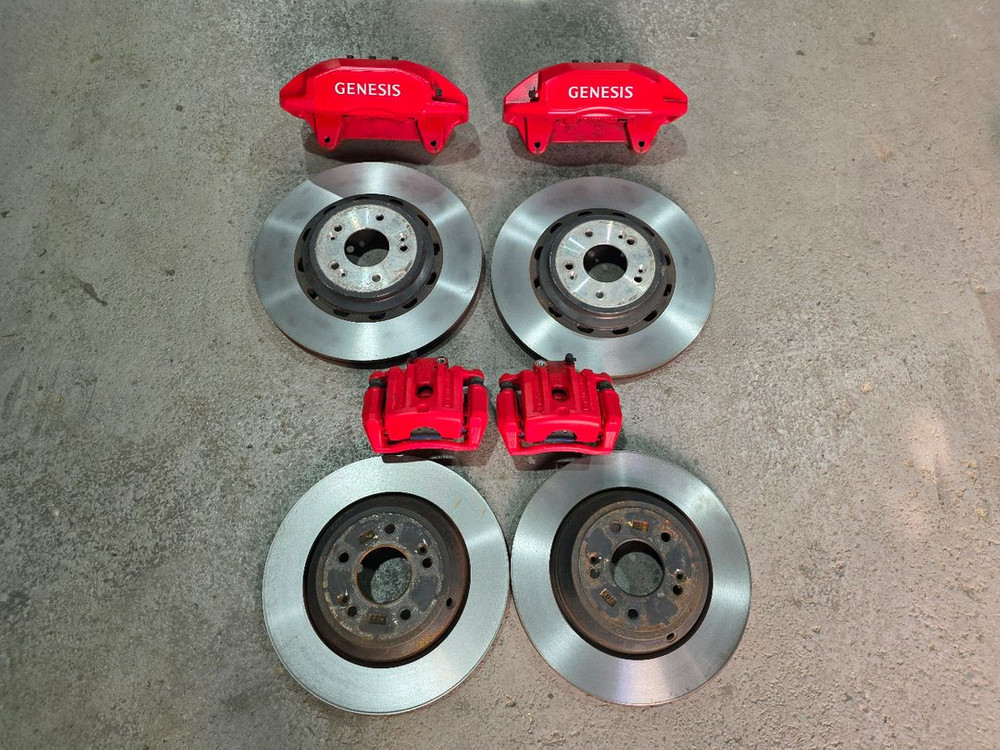 앞 55만 뒤 15만 앞, 뒤 세트 일괄 65만 일반 모델 345mm 4P 아니고 G80 스포츠 순정 4P 브레이크 입니다. 앞 디스크 360mm 4P 캘리퍼 뒤 디스크 330mm 뒤도 일반 모델 보다 사이즈 커요 패드 많이 남았구요 캘리퍼는 레드로 도장 새로 했습니다. 순정 19인치 DH, G80 일반 브레이크에 호환 가능 직거래는 남양주 010 2397 0679 장착샵 연결 가능 공임 별도