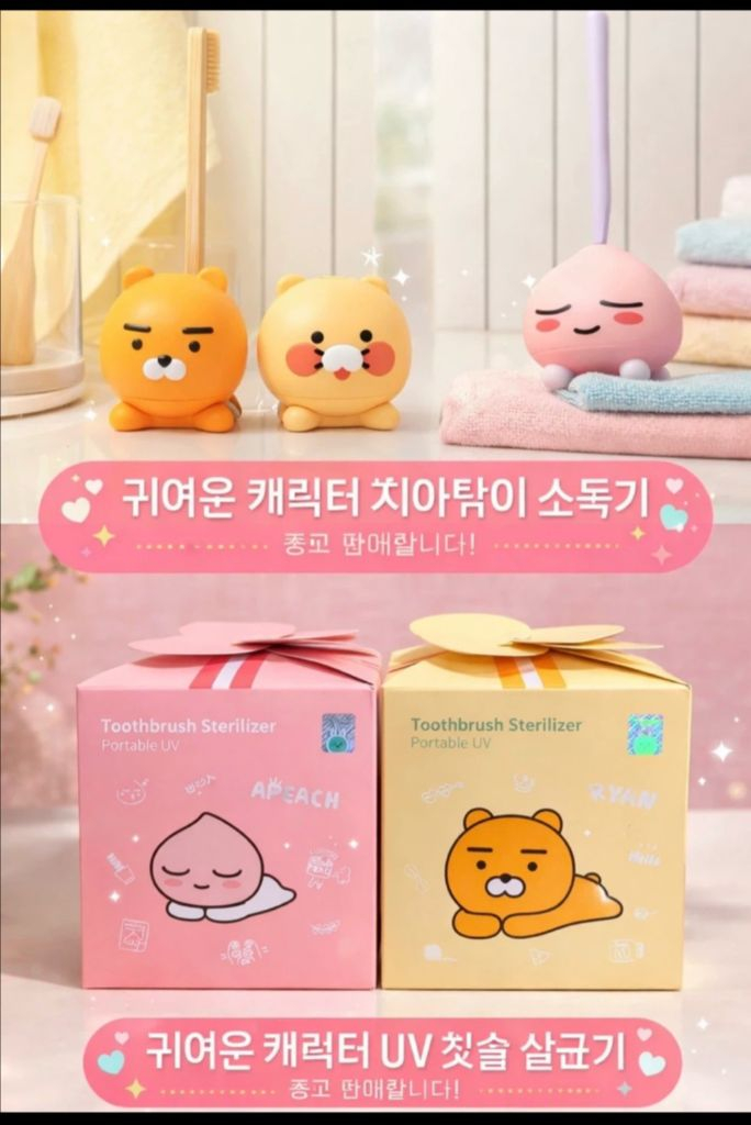 개인정보(거래정보)를 주고받는 행위는 사기에 노출될 수 있으므로 즉시 중고나라로 신고해 주세요귀여운 캐릭터 디자인의 UV 칫솔 살균기예요. 새상품 미개봉 상태로 깨끗하게 보관되어 있습니다. 칫솔을 위생적으로 관리할 수 있는 실용적인 아이템이에요! - 라이언, 어피치 모양 (기념품으로 받은 물품 입니다.)