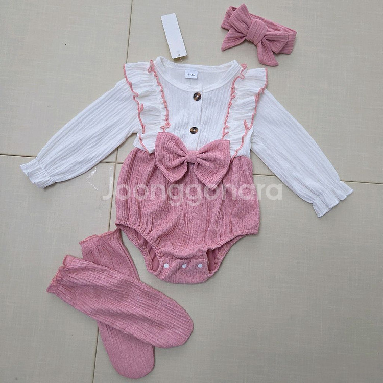 (9-12M) 택도 안뜯은 새상품입니다🙏 헤어밴드는 풀려있었어서 임의로 제가 리본 모양만든거라 머리 사이즈에맞게 다시 묶으시면 되고 소매와 어깨라인, 반스타킹 양말까지 프릴 스타일로 포인트되어 봄느낌 물씬나는 핑크핑크한 공주 디자인이에용 🥰💗
