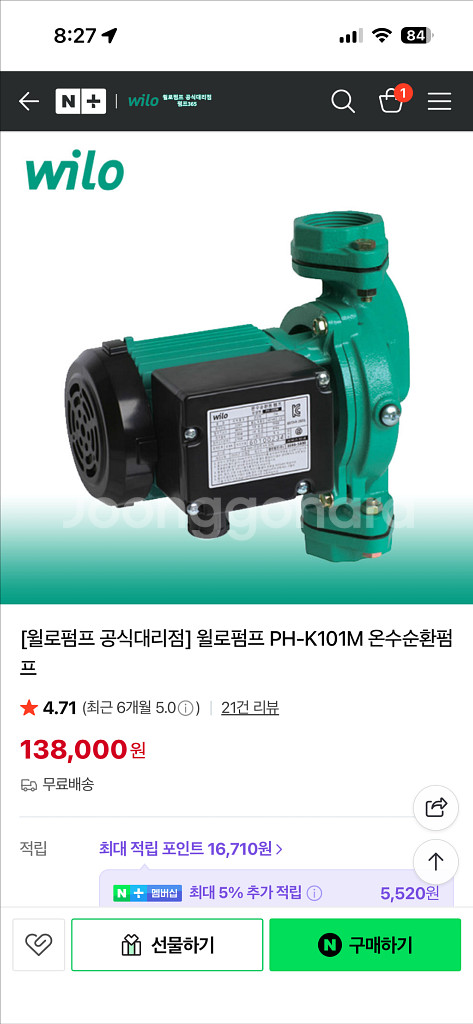 윌로펌프 온수순환펌프 PH-K101M 창고에 보관만 한 새제품입니다 40mm
