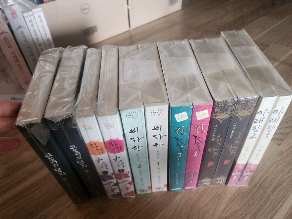 비닐포장이 되어있어 새 상품 같은 상태예요. 로맨스소설 판매합니다. 전부 최상인데 화인,비파향이 아랫부분 변색있습니다(조은세상,파피루스,신영출판사가 한쪽면이 많이 그렇더라고요.) 택포 40,000입니다. 010 6327 사오68 문자주세요.