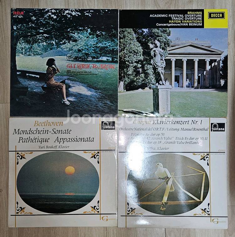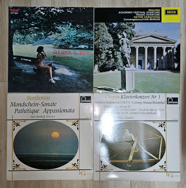 프레싱 : 성음 레코드 1. 프랭크 책스필드 – Immortal Serenades (DECCA) 2. 드보르작 – 신세계 교향곡 / 빈 필하모닉 / 쿠벨릭 (DECCA) 3. 쇼팽 – 에튀드 Op.10 & Op.25 / 블라디미르 아쉬케나지 (DECCA) 4. 멘델스존 이탈리아 교향곡 / 슈베르트 미완성 교향곡 (Fontana) 5. Get Back to Archie (RCA Red Seal) 6. 브람스 대학축전 서곡 / 비극적 서곡 / 하이든 변주곡 / 반 베이눔 (DECCA) 7. 베토벤 – 월광 / 비창 / 열정 소나타 / 유리 부코프 (Fontana) 8. 쇼팽 – 피아노 협주곡 1번 / 치프라 (Fontana) ⛰️문고리거래 또는 택배시 0.5추가 ⛰️장시간 보관만 했던거라, 판 세척후 청음 하시길 바랍니다 ⛰️쿨거래 환불네고불가