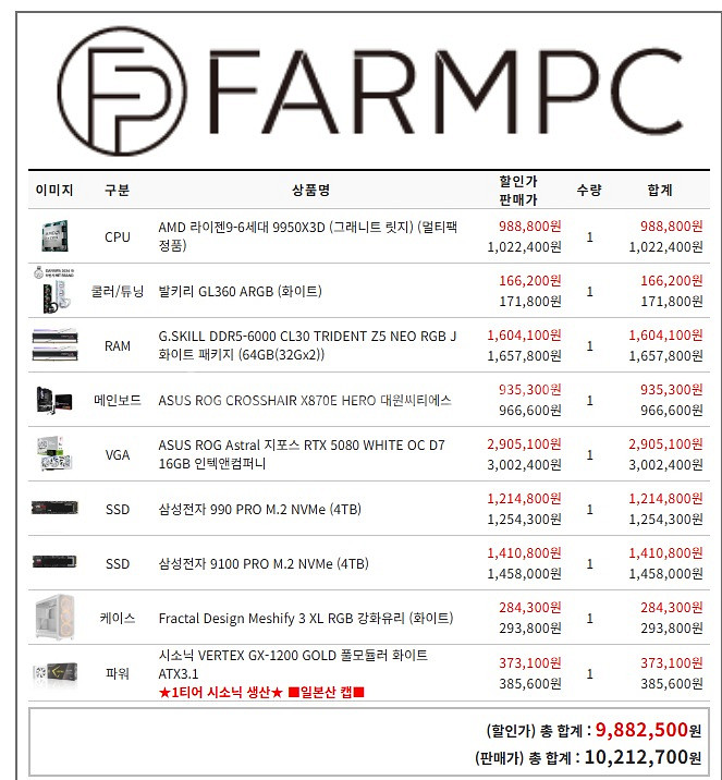 CPU : AMD 라이젠9-6세대 9950X3D 정품 메인보드 : ASUS ROG CROSSHAIR X870E HERO 램 : G.SKILL DDR5-6000 CL30 TRIDENT Z5 NEO RGB J 화이트 패키지 (64GB(32Gx2)) 그래픽 : ASUS ROG Astral 지포스 RTX 5080 WHITE OC D7 16GB 인텍앤컴퍼니 SSD : 삼성전자 990 PRO M.2 NVMe (4TB) SSD : 삼성전자 9100 PRO M.2 NVMe (4TB) PCI 5.0 쿨러 : 키리 GL360 ARGB (화이트) 파워 : 시소닉 VERTEX GX-1200 GOLD 풀모듈러 화이트 ATX3.0 케이스 : Fractal Design Meshify 3 XL RGB 강화유리 (화이트) 쿨러 : Fractal Design Momentum 14 RGB (화이트) 대략이정도이구요.. 2025년 10월에구매했습니다.전부 정품으로구매했습니다. 실사용적습니다. 디아블로4조금하다가.. 오버스펙이라 처분합니다. 인천직거래만가능합니다 오셔서 확인후 가지고가셔야합니다. 택배x 모든박스 보관중이면 그래픽카드 보드 보증연장되있습니다. 010 7767 7877