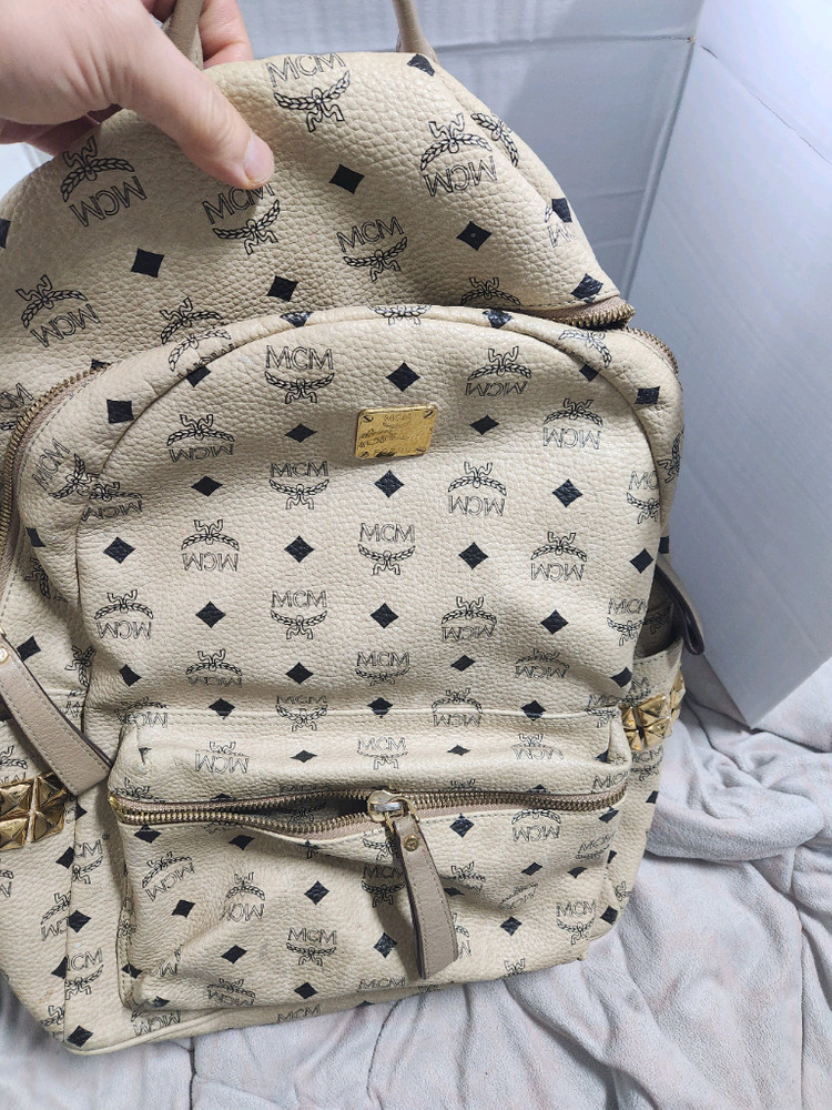 시그니처 모노그램 패턴의 백팩이에요. 베이지 컬러에 브라운 가죽 트림으로 고급스럽고, 전체적으로 깔끔한 상태입니다. 실용적이면서도 세련된 디자인으로 데일리용으로 완벽해요! 엠씨엠 정품입니다