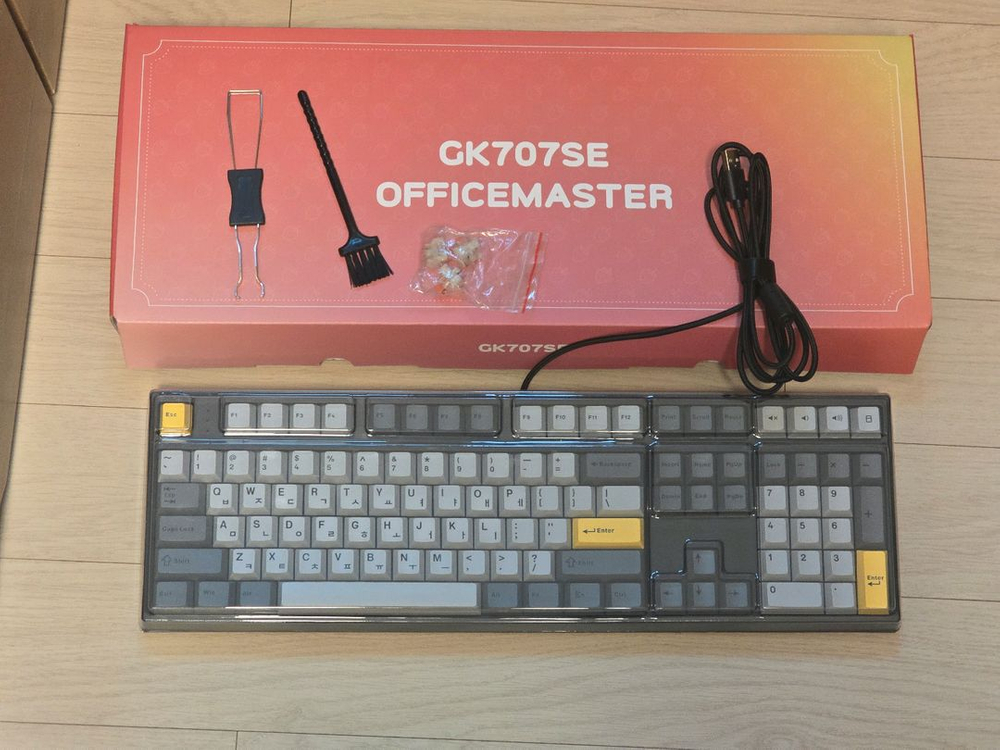 유선 키보드이고 키캡빼고 먼지 제거해두었습니다 구성품은 사진 참고해주시고 상자 하자 확인해주세요 6개월정도 사용후 보관중입니다