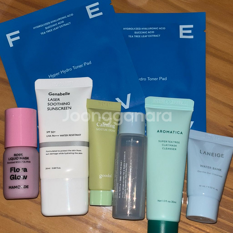 피브 하이퍼 하이드로 토너 패드 2개 구달 맑은 어성초 진정 수분 크림 10미리 아로마티카 슈퍼 티트리 클레이 마스크 클렌저 30미리 마몽드 플로라 글로우 로즈 리퀴드 마스크 15미리 라네즈 워터뱅크 블루 히알루로닉 클렌징 오일 25미리 (약 20미리 남음) 제나벨 레이저 수딩 선스크린 20미리 라네즈 워터뱅크 젠틀 젤 클렌저 10미리 나머지 새상품