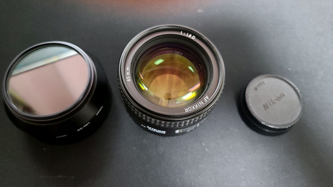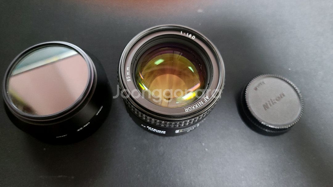 85mm f/1.8 단렌즈와 UV필터가 함께 있는 세트예요. 렌즈 상태는 양호하고 UV필터도 깨끗한 편입니다. 인물 촬영용으로 바로 사용 가능해요!