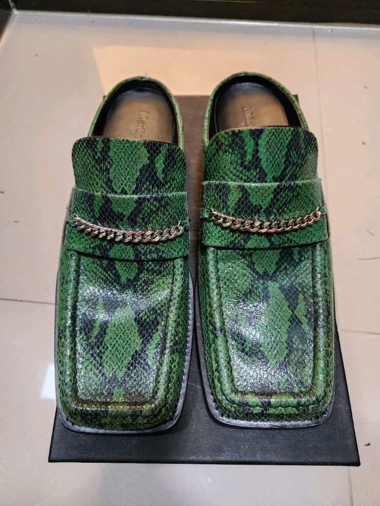 마틴로즈 그린 뱀피 뮬 GD 지드래곤도 사랑하고 일상생활이든 명품쇼에서 자주 착용하는 마틴로즈입니다 147만원 가량의 희귀 그린 뱀피 아카이브 상당히 럭셔리하고 세련된 디자인의 제품으로 어떤 코디에도 이거하나 신으면 포인트 끝납니다 레드 블랙 뮬이나 로퍼 다 판매했지만 이거는 판매안하고 소장하다 마지막으로 판매합니다 매물도 없고 진짜 다른 색상과는 차원이 다른 아름다운 색감입니다 청바지 슬랙스 치노 다 찰떡이고 이거 신고 다니시면 무조건 신발 이쁘다는 소리 듣고 시선집중됩니다 새상품서 프리미엄 명품 비브람 보강후 실착1회 앞코, 바닥, 굽 보심 아실겁니다 사람들 엄청 신고 걸레같은거 몇회 안신었다고 올리는 사람 태반이던데 그런거 안사시는게 좋습니다 마틴로즈를 워낙 좋아해서 로퍼나 뮬 아주 많이 판매했었습니다 사이즈42 황금사이즈 41이나 42신으심 맞습니다 42가 뮬은 완전 황금사이즈 입니다 이건 장담하는데 실물보심 감탄하실겁니다 마틴로즈 좋아하심 무조건 만족하실겁니다 고민하지 마세요 고민하다 품절입니다
