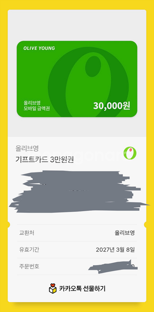 올리브영 3만원 모바일 상품권이에요. 유효기간은 2027년 3월 8일까지라서 충분히 사용하실 수 있어요!