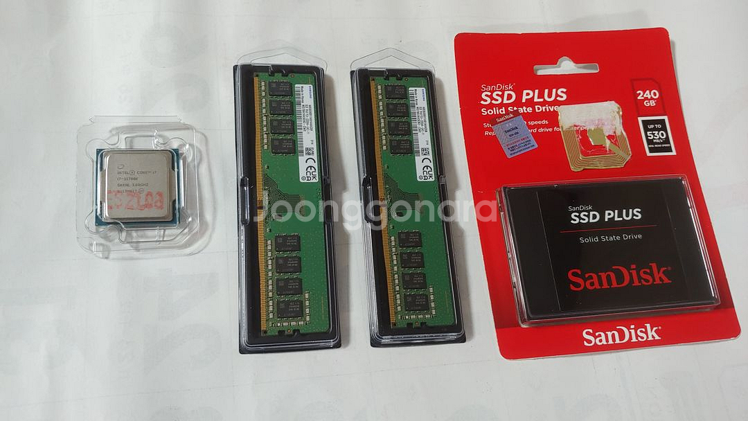 인텔 i7 11700K CPU,DDR4램 8Gx2,SSD 세트 팝니다.. 인텔 i7 11700K(벌크). 삼성 DDR4 3200 8Gx2 = 16G. Sandisk SSD PLUS (240GB). (미개봉품) 이렇게 3종 세트로 팔고 작동확인했고 상태이상없습니다.. 인텔 i7 11700K(벌크).CPU : 작동이상없고 사용감 거의 없습니다.. 램은 삼성 DDR4 3200 8Gx2(개) = 16G. 이고 상태 괜찮고 깨끗합니다.. 샌디스크 (SATA3방식.)SSD 240G는 AS기간 남은 미개봉품입니다.. 연식은 괜찮고 사용을 많이 안해서 생활감도 없는편으로 상태 괜찮고 깨끗합니다.. 상태나 작동등은 사진참조 하면될듯하고 일괄세트 판매 우선입니다.. 각개는 가격 상이합니다.. (개별가격들은 CPU:30,램:13,SSD:8만 정도입니다..),(일괄,낱개판매등 번장페이 수수료때문에 약간 더 올려서 팝니다.) 가격:일괄 578000원. 기본사항은 적어놨고 가격등의 질문은 사양이고 (가격네고X.) 거래는 직거래시 (대구 북구 태전삼거리,태전역근처 가능합니다.) 택배거래시 착불:(편의점택배,우체국) OR 반값택배(2500원.):크기등으로 반값택배는 어려울수도 있습니다. 선불:(4000원.(편의점,우체국택배,대신택배),(GS반값택배:2500원,CU:2600원.) 직거래시 (대구 북구 태전삼거리,태전역근처 가능합니다.) 거래후 반품X,환불X 입니다.. 문의등은 문의 주시면 답변드리겠습니다..
